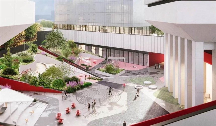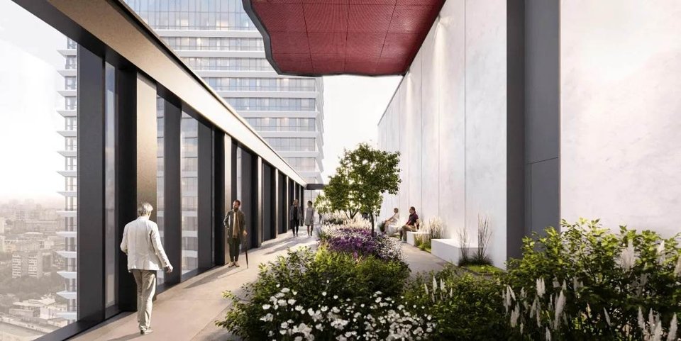 Шесть лифтов в каждой башне обеспечат моментальный доступ на самый высокий этаж всего за 45 секунд. На территории комплекса есть отдельное шестиэтажное здание. Там есть спортивные площадки и офисы. На первом и втором этаже здания есть фитнес-центр с большим бассейном и саунами. Здесь есть детская площадка и зоны отдыха под открытым небом. Внутренний двор разделен от городского пространства искусственным холмом с садом.